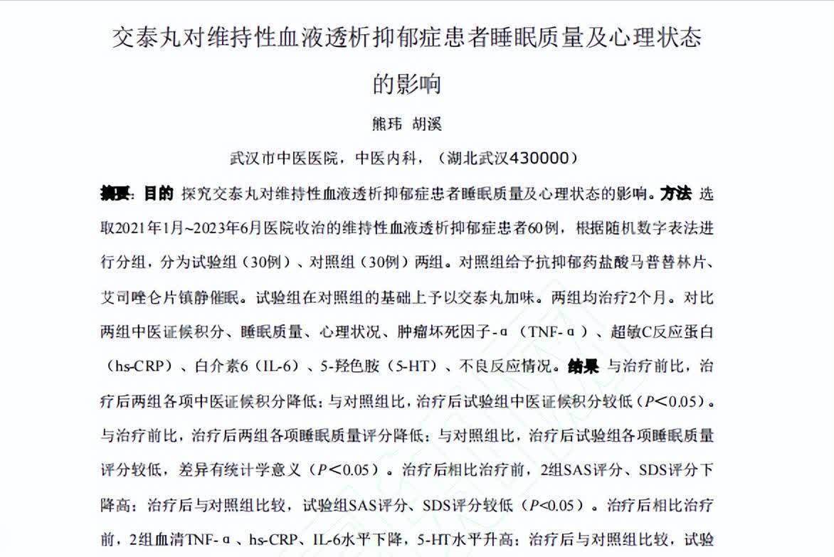 参考资料[1]熊玮 ,交泰丸对维持性血液透析抑郁症患者睡眠质量及心理状态的影响,武汉市中医医院指南针股票,2024-07-11